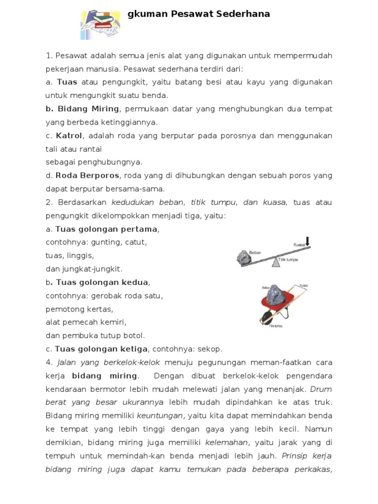 Usaha Dan Pesawat Sederhana from imgv2-1-f.scribdassets.com Kali ini pakdosen akan membahas tentang pesawat sederhana? Semua jenis alat yang digunakan untuk memudahkan pekerjaan manusia disebut pesawat. Ingin mempelajari materi fisika, khususnya mengenai pesawat sederhana secara lebih mendalam? Oleh bitardiposting pada agustus 2, 2020mei 17, 2021. Lembar kerja peserta didik mata pelajaran ipa materi pesawat sederhanafull description. Pesawat sederhana dapat dibedakan menjadi beberapa macam antara lain, tuas/pengungkit, katrol, roda, dan bidang miring. Pesawat sederhana adalah alat mekanik yang dapat mengubah arah atau besaran dari suatu gaya. Pesawat sederhana adalah peralatan yang bisa memudahkan pekerjaan manusia.